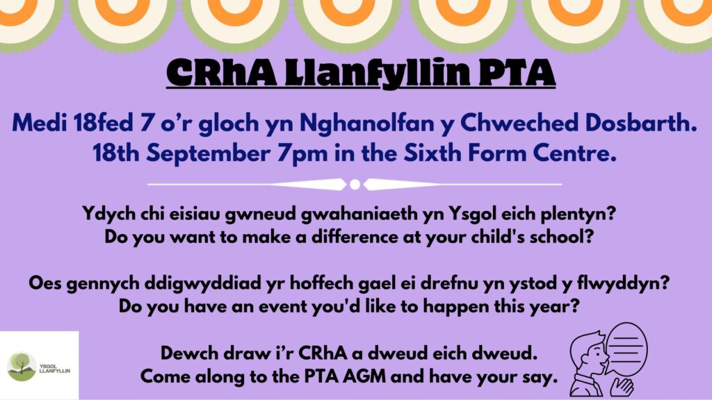 The Llanfyllin PTA AGM is taking place on 18th September at 7pm in the 6th form centre and on Zoom. Join us and make a difference!